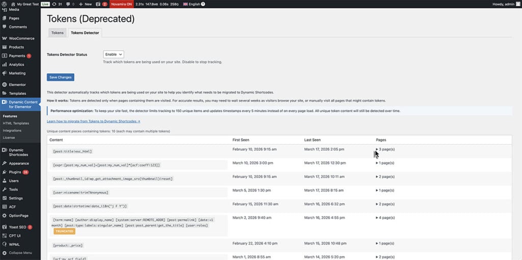 Tokens is the legacy dynamic text system in Dynamic Content for Elementor. If you’ve been using it, you know it’s time to migrate to Dynamic Shortcodes. But where do you start? On a site with dozens of pages, templates, and loops, tracking down every [post:title] or [user:display_name] scattered across your layouts is like searching for needles in a haystack.